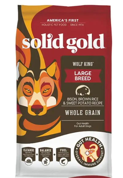 Rețeta de bizon regele lup din aur solid și orez brun este destinată câinilor adulți de talie mare. Ingredientele principale sunt bizoni, făină de pește oceanic, orez brun, fulgi de ovăz și orz perlat. De asemenea, conține morcovi, dovleac, afine și merișoare pentru a adăuga nutrienți. Rețeta conține o cantitate medie de proteine pentru hrana pentru câini, dar are mai puține grăsimi și calorii, așa că poate ajuta câinele tău adult să mențină o greutate sănătoasă.